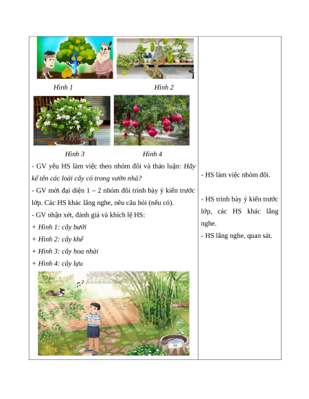 - GV nhận xét, đánh giá và khích lệ HS: lớp, các HS khác lắng + Hình 1: cây bưởi nghe. + Hình 2: cây khế - HS lắng nghe, quan sát.