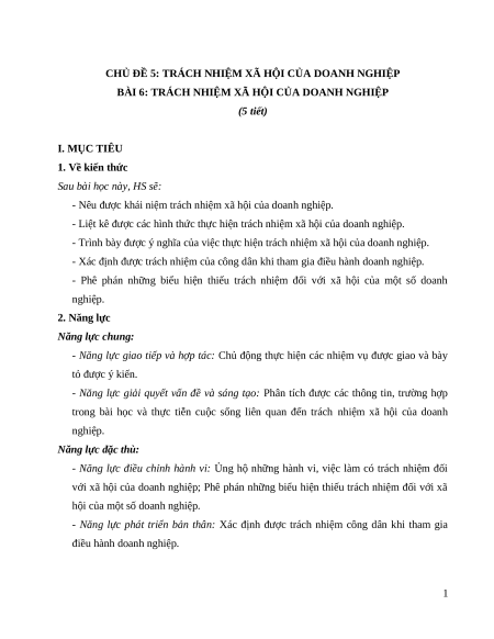 BÀI 6: TRÁCH NHIỆM XÃ HỘI CỦA DOANH NGHIỆP (5 tiết) I. MỤC TIÊU 1. Về kiến thức