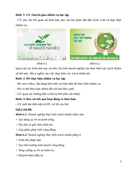 - GV yêu cầu HS quan sát hình ảnh, trả lời câu hỏi Mở đầu SGK tr.46 về trách nhiệm xã hội của doanh nghiệp.