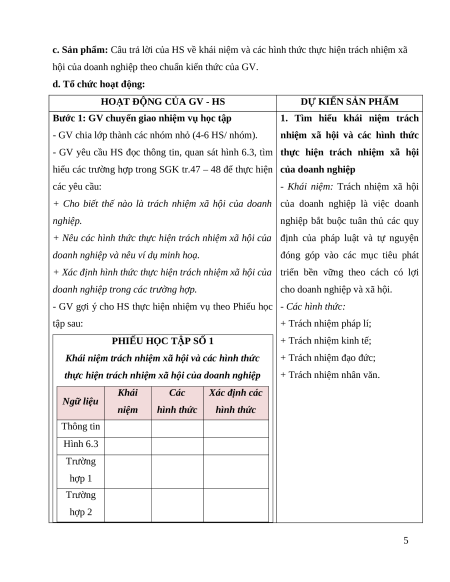 c. Sản phẩm học tập: Câu trả lời của HS về trách nhiệm xã hội của doanh nghiệp.