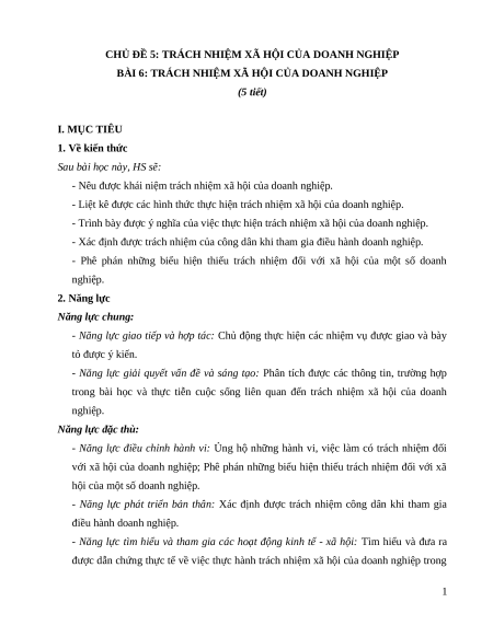 BÀI 6: TRÁCH NHIỆM XÃ HỘI CỦA DOANH NGHIỆP (5 tiết) I. MỤC TIÊU 1. Về kiến thức