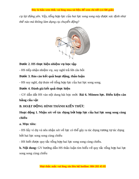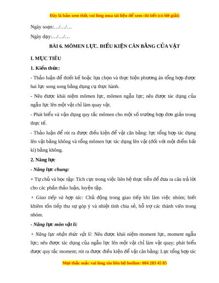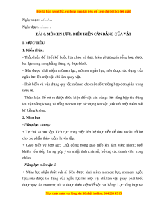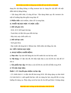 Đây là bản xem th , vu ử i lòng mua tài li u ệ đ xe ể m chi ti t (c ế ó l i ờ gi i ả ) Ngày so n: ạ …/…/… Ngày d y: ạ …/…/… BÀI 6. MÔMEN L C Ự . ĐI U Ề KI N Ệ CÂN B N Ằ G C A Ủ V T Ậ I. M C Ụ TIÊU 1. Ki n t ế h c ứ : - Th o ả lu n ậ để thi t ế kế ho c ặ l a ự ch n ọ và th c ự hi n ệ phư ng ơ án t ng ổ h p ợ đư c ợ hai l c s ự ong song b ng ằ d ng c ụ t ụ h c hành. ự - Nêu đư c ợ khái ni m ệ mômen l c, ự mômen ng u ẫ l c; ự nêu đư c ợ tác d ng ụ c a ủ ngẫu l c l ự ên m t ộ v t ậ ch l ỉ àm quay v t ậ . - Phát bi u ể và v n ậ d ng ụ quy t c ắ mômen cho m t ộ s ố trư ng ờ h p ợ đ n ơ gi n ả trong th c t ự . ế - Th o ả lu n ậ để rút ra đư c ợ đi u ề ki n ệ để v t ậ cân b ng: ằ l c ự t ng ổ h p ợ tác d ng ụ lên v t ậ b ng ằ không và t ng ổ mômen l c ự tác d ng ụ lên v t ậ (đ i ố v i ớ m t ộ đi m ể b t ấ kì) b ng ằ không. 2. Năng l c ự