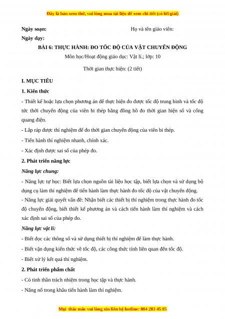Giáo án Bài 6 Vật lí 10 Kết nối tri thức (2024): Thực hành đo: Đo tốc độ của vật chuyển động