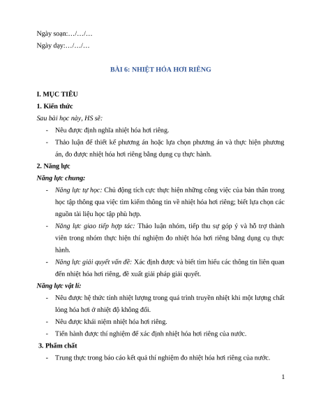 BÀI 6: NHIỆT HÓA HƠI RIÊNG I. MỤC TIÊU 1. Kiến thức