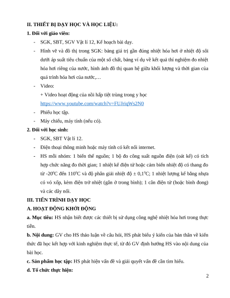 II. THIẾT BỊ DẠY HỌC VÀ HỌC LIỆU: