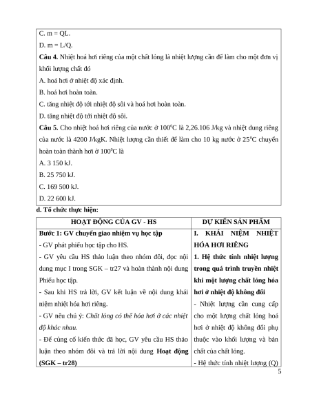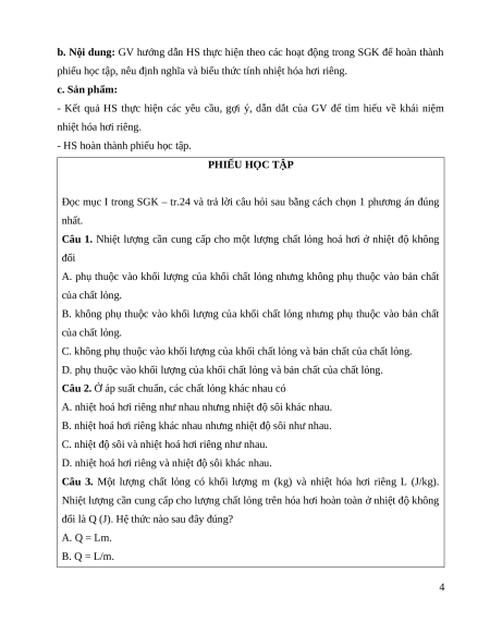 phiếu học tập, nêu định nghĩa và biểu thức tính nhiệt hóa hơi riêng. c. Sản phẩm: