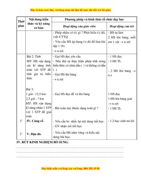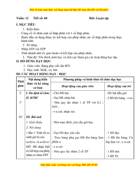 - Bước đầu sử dụng được t/c kết hợp của phép nhân các số thập phân trong thực hành tính. 2. Kĩ năng: - Nhân STP với STP