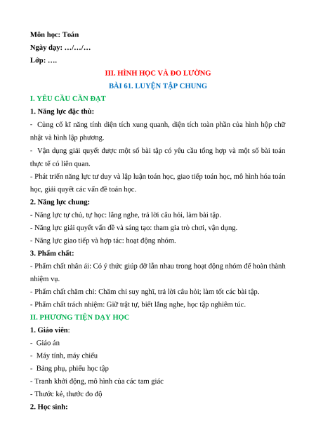 Giáo án Bài 61: Luyện tập chung Toán lớp 5 Cánh diều