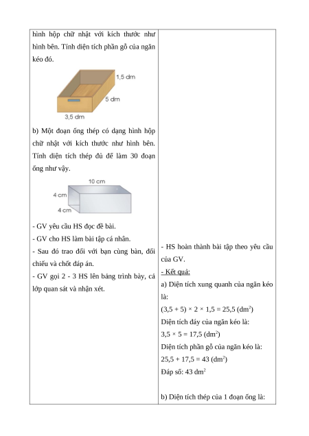 - Củng cố kĩ năng tính diện tích xung quanh, diện tích toàn phần của hình hộp chữ