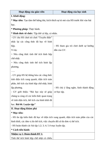 - Củng cố kĩ năng tính thể tích hình hộp chữ nhật và hình lập phương.