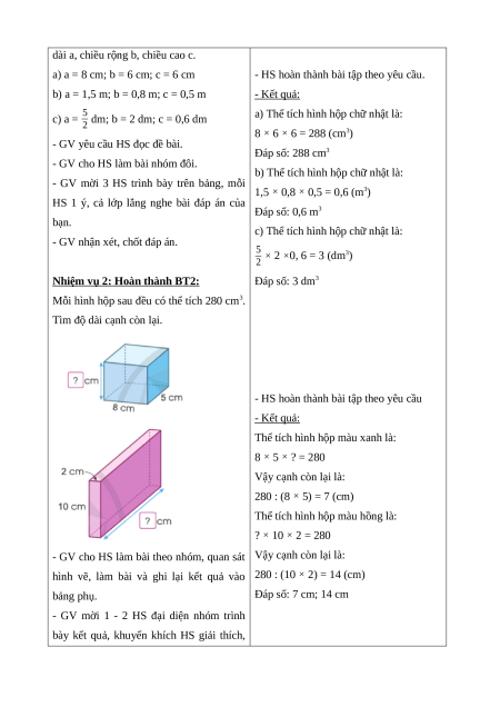 - GV yêu cầu HS đọc đề bài. Đáp số: 288 cm3
