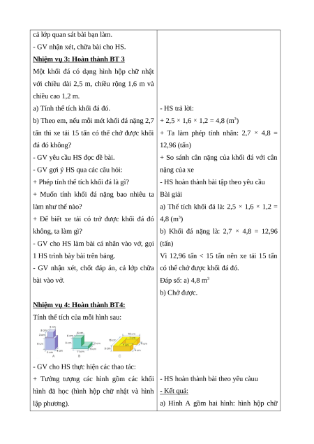 - GV nhận xét, chốt đáp án, cả lớp chữa có thể chở được khối đá đó. bài vào vở. Đáp số: a) 4,8 m3 b) Chở được.