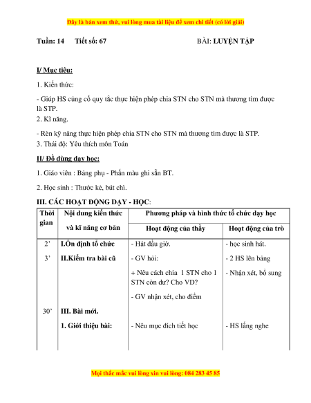 I.Ổn định tổ chức - Hát đầu giờ. - học sinh hát. 3’ II.Kiểm tra bài cũ - GV hỏi: - 2 HS lên bảng + Nêu cách chia 1 STN cho 1 - Nhận xét, bổ sung STN còn dư? Cho VD? - GV nhận xét, cho điểm 30’ III. Bài mới.