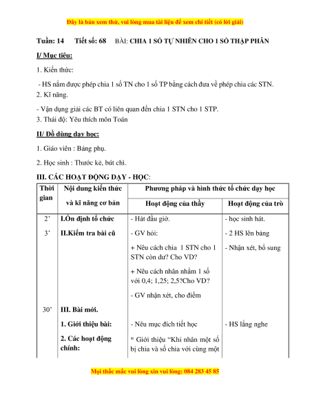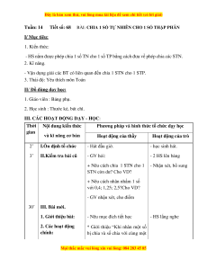Tuần: 14 Tiết số: 68 BÀI: CHIA 1 SỐ TỰ NHIÊN CHO 1 SỐ THẬP PHÂN I/ Mục tiêu: 1. Kiến thức: