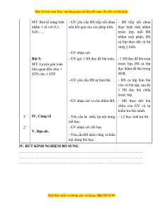 I.Ổn định tổ chức - Hát đầu giờ. - học sinh hát. 3’ II.Kiểm tra bài cũ - GV hỏi: - 2 HS lên bảng + Nêu cách chia 1 STN cho 1 - Nhận xét, bổ sung STN còn dư? Cho VD?
