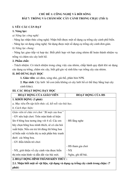 - Năng lực sử dụng công nghệ: Sử dụng được một số dụng cụ trồng cây cảnh đơn giản. b) Năng lực chung: