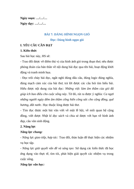 Giáo án Bài 7: Dáng hình ngọn gió Tiếng Việt lớp 5 Chân trời sáng tạo