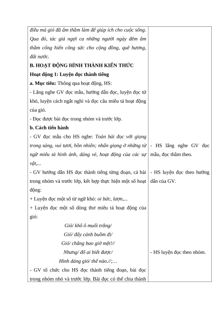 khó, luyện cách ngắt nghỉ và đọc câu miêu tả hoạt động của gió.