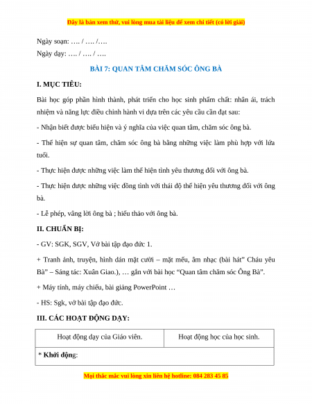 BÀI 7: QUAN TÂM CHĂM SÓC ÔNG BÀ I. MỤC TIÊU: