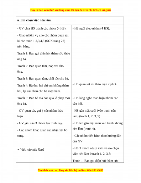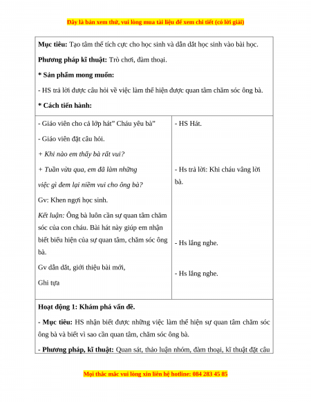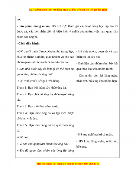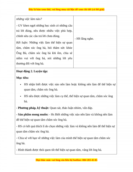 - HS trả lời được câu hỏi về việc làm thể hiện được quan tâm chăm sóc ông bà. * Cách tiến hành: