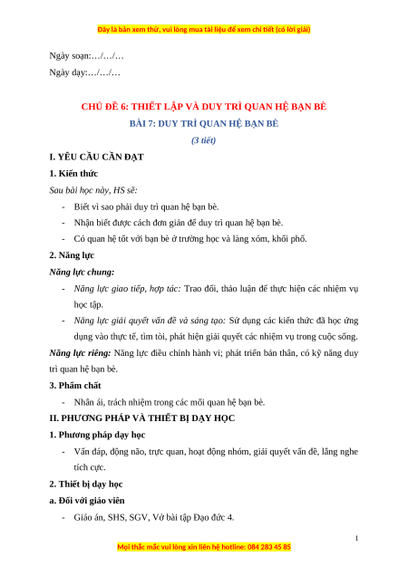 BÀI 7: DUY TRÌ QUAN HỆ BẠN BÈ (3 tiết)