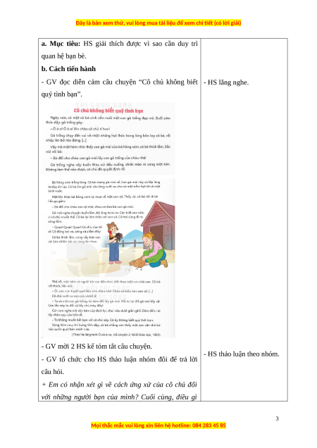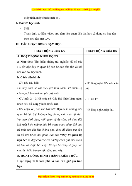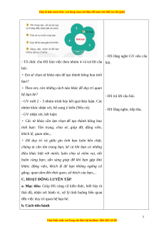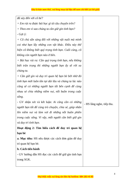 HS về việc duy trì quan hệ bạn bè, tạo tâm thế và kết nối vào bài học mới. b. Cách tiến hành - GV nêu câu hỏi: - HS lắng nghe GV nêu câu