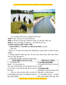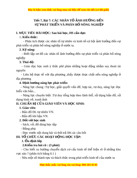ậ sơ đồ các nhân tố nh a hư ng ơ đ n ế sự phát tri n ể và phân b ố nông nghiệp 3. Thái đ : ộ - Giáo d c ụ h c ọ sinh ý th c ứ phê phán nh ng ữ ho t ạ đ ng ộ nh m ằ suy thoái tài nguyên - Liên hệ th c ự tế v i ớ đ a ị phư ng ơ ,th y ấ đư c ơ th c ự ch t ấ n n ề nông nghi p ệ ơ địa phư ng ơ 4. Đ nh h ị ư ng năng l ớ c ự phát tri n: ể - Năng l c ự chung :Tự h c, ọ gi i a quy t ế v n ấ đ , ề h p ơ tác, tư duy, năng l c ự đ c ọ hi u văn ể b n... a - Năng l c ự chuyên bi t ệ :Tư duy t ng ổ h p ơ theo lãnh th , ổ sử d ng ụ b n a đ , ồ sử d ng hì ụ nh vẽ, tranh nh a II. CHUẨN BỊ C A Ủ GIÁO VIÊN VÀ H C Ọ SINH: 1. Giáo viên: - B n a đồ ĐL t nhi ự ên VN. - B n a đồ khi h u ậ VN. 2. Đ i ố v i ớ h c s ọ inh - Sách, v , đ ơ ồ dùng h c t ọ p ậ - B ng a phụ - Đ c t ọ rư c n ớ i ộ dung bài và th t ử r l a i ơ các câu h i o III. T C Ô H C Ư CÁC HO T Ạ Đ N Ộ G H C Ọ T P Â :