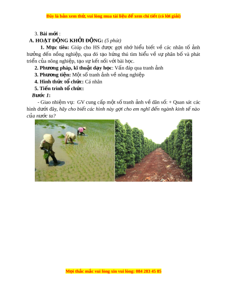 ọ : Vấn đáp qua tranh nh a 3. Phư ng ơ ti n: ệ M t ộ số tranh nh a v nông nghi ề p ệ 4. Hình th c t ứ ch ổ c: ứ Cá nhân 5. Ti n t ế rình t ch ổ c ứ : Bước 1: - Giao nhi m ệ v : ụ GV cung c p ấ m t ộ s ố tranh nh a v ề dân s : ố + Quan sát các hình dư i