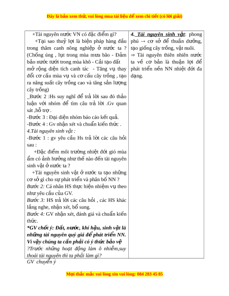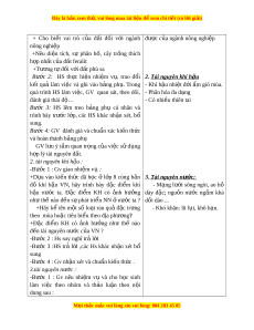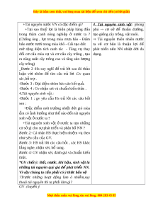3. Tài nguyên nư c: ớ đồ khi h u ậ VN, hãy trình bày đ c ặ đi m ể khi - M ng ạ lư i ớ sông ngòi, ao hồ h u ậ nư c ớ ta. Đ c ặ đi m ể KH có nh a hư ng ơ dày đ c; ặ ngu n ồ nư c ớ ng m â khá nh t ư hế nào đ n s ế ự phát tri n N ể N ơ nư c t ớ a ? dồi dào ... +Hãy kể tên m t ộ s ố lo i ạ rau qu a đ c ặ tr ng ư - Khó khăn: lũ l t ụ , khô h n. ạ theo mùa hoặc tiêu bi u t ể heo đ a ph ị ư ng ơ ? +Đ c ặ đi m ể KH có nh a hư ng ơ như thế nào đ n t ế ài nguyên nư c c ớ a ủ VN ? -Bư c ớ 2 : Hs suy nghĩ tr l a i ơ -Bư c ớ 3 :HS tra l i ơ ,các Hs khác nh n ậ xét bổ sung -Bư c ớ 4 : Gv nh n xét ậ và chu n k ẩ i n ế th c . ứ 3.tài nguyên nước : -Bư c ớ 1 : Gv nêu nhi m ệ vụ và cho h c ọ sinh làm vi c ệ theo nhóm và th o a lu n ậ theo n i ộ dung sau : M i ọ thắc m c