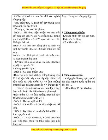 Đây là bản xem th , vu ử i lòng mua tài li u ệ đ xe ể m chi ti t (c ế ó l i ờ gi i ả ) + Cho bi t ế vai trò c a ủ đ t ấ đ i ố v i ớ ngành đư c ơ c a ngành ủ nông nghi p ệ nông nghiệp +Nêu di n ệ tich, sự phân b , ố cây tr ng ồ thich h p ơ nh t ấ c a ủ đ t ấ feralit +Tư ng t ơ đ ự i ố v i ớ đ t ấ phù sa Bư c ớ 2: HS th c ự hi n ệ nhi m ệ v , ụ trao đ i