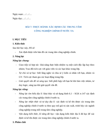 định và kể tên được các trung tâm công nghiệp chính ở nước ta. 3. Phẩm chất -