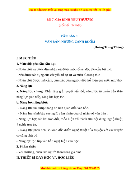 Bài 7. GIA ĐÌNH YÊU THƯ N Ơ G (S t ố i t ế : 12 ti t ế ) VĂN BẢN 1. VĂN BẢN: NH N Ữ G CÁNH BU M Ồ (Hoàng Trung Thông) I. M C Ụ TIÊU 1. Mức đ / ộ yêu c u c ầ n đ ầ t ạ : - Nh n ậ bi t ế và bư c ớ đ u nh ầ n xét ậ đư c ợ m t ộ s nét ố đ c ộ đáo c a bài ủ th . ơ - Nêu đư c ợ tác d ng c ụ a ủ các y u t ế ố t s ự ự và miêu t t ả rong th . ơ - Nh n bi ậ t ế đư c ợ tình c m ả , c m ả xúc c a ủ ngư i ờ vi t ế th hi ể n qua ngôn ng ệ t ữ h . ơ 2. Năng l c ự a. Năng l c