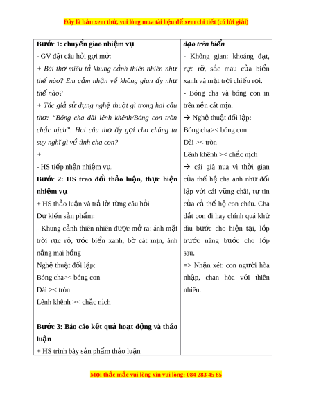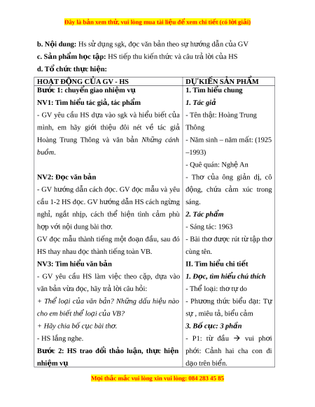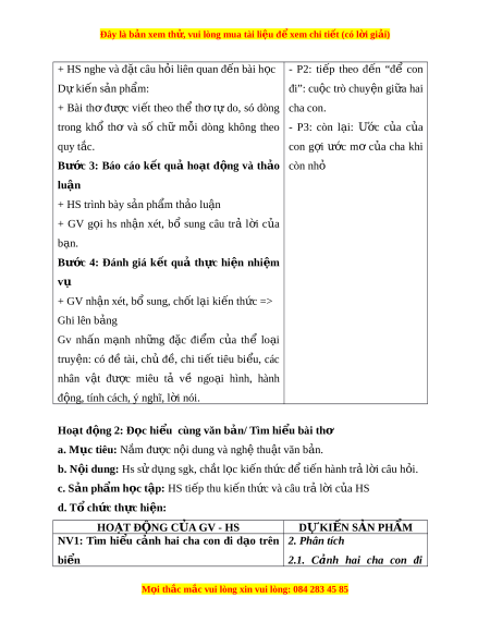Đây là bản xem th , vu ử i lòng mua tài li u ệ đ xe ể m chi ti t ế (có l i ờ gi i ả ) + HS nghe và đ t ặ câu h i ỏ liên quan đ n bài ế h c ọ - P2: ti p ế theo đ n ế “để con Dự ki n s ế n ả phẩm: đi”: cu c ộ trò chuy n ệ gi a ữ hai + Bài thơ đư c ợ vi t ế theo thể th ơ t ự do, só dòng cha con.