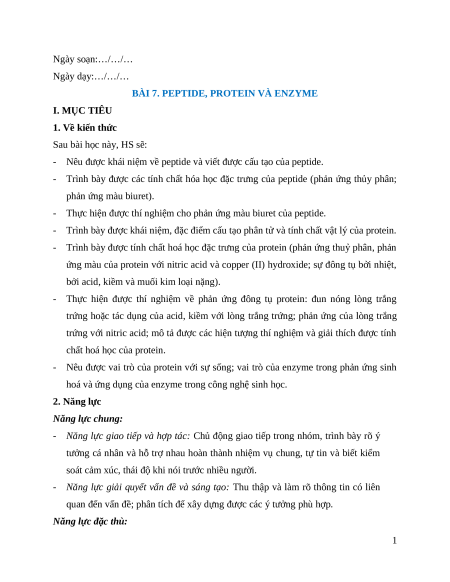 BÀI 7. PEPTIDE, PROTEIN VÀ ENZYME I. MỤC TIÊU 1. Về kiến thức Sau bài học này, HS sẽ: