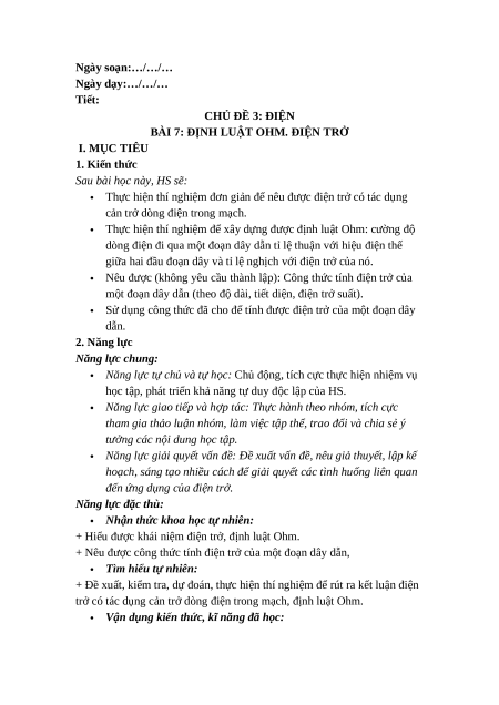 Giáo án Bài 7 Khoa học tự nhiên 9 Cánh diều (2024): Định luật Ohm. Điện trở