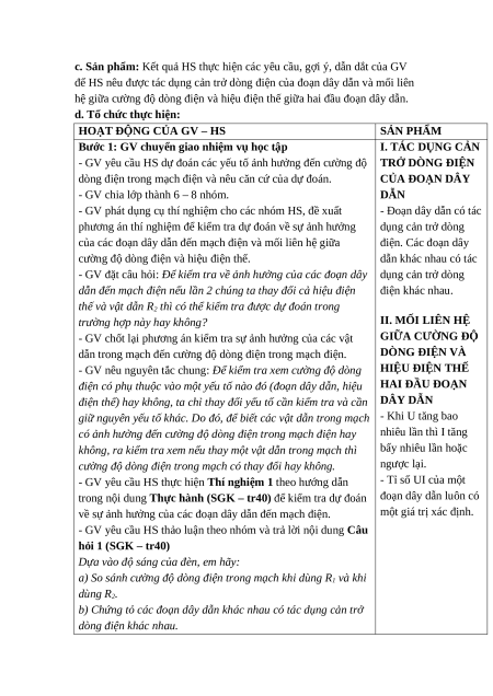 - HS nêu được nhận xét về tác dụng cản trở dòng điện của đoạn dây dẫn.