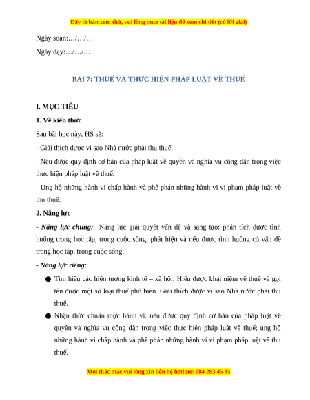 BÀI 7: THUẾ VÀ THỰC HIỆN PHÁP LUẬT VỀ THUẾ I. MỤC TIÊU 1. Về kiến thức Sau bài học này, HS sẽ: