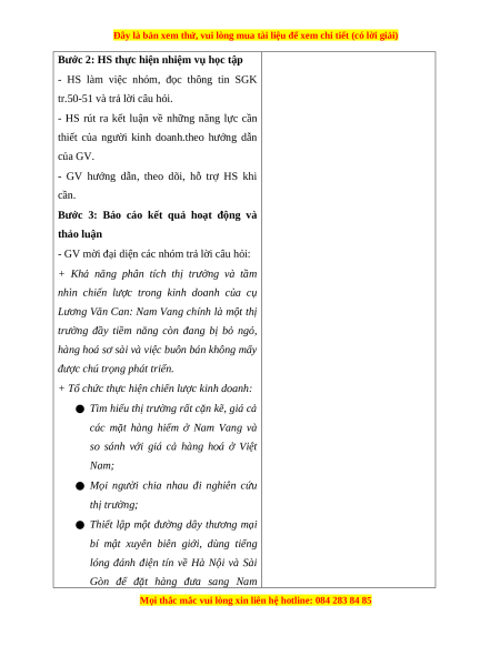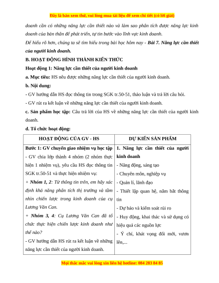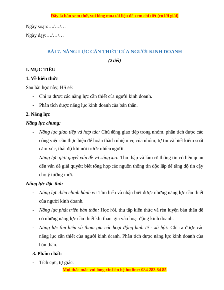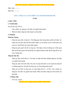 BÀI 7. NĂNG LỰC CẦN THIẾT CỦA NGƯỜI KINH DOANH (2 tiết) I. MỤC TIÊU 1. Về kiến thức Sau bài học này, HS sẽ: