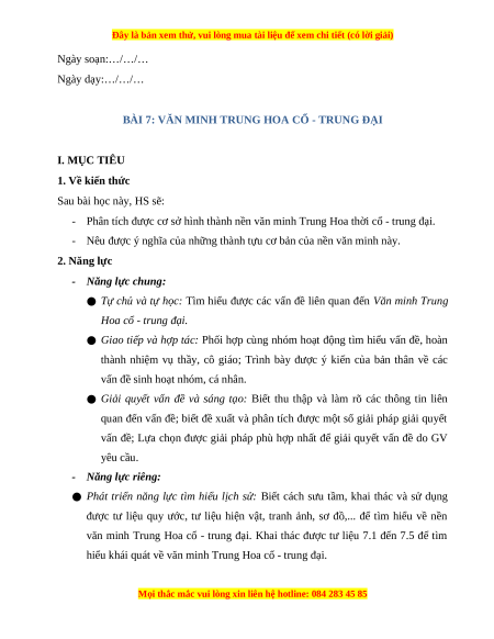 BÀI 7: VĂN MINH TRUNG HOA CỔ - TRUNG ĐẠI I. MỤC TIÊU 1. Về kiến thức Sau bài học này, HS sẽ: