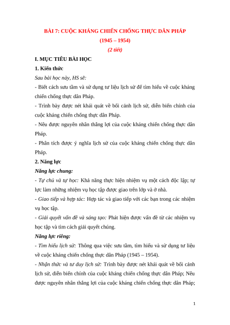BÀI 7: CUỘC KHÁNG CHIẾN CHỐNG THỰC DÂN PHÁP (1945 – 1954) (2 tiết)