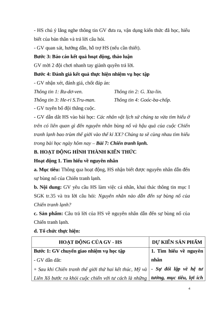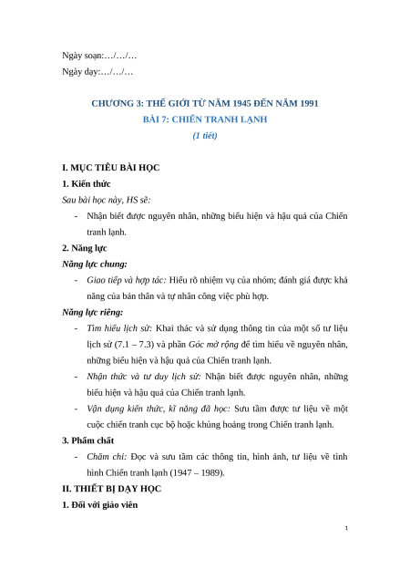 - Nhận biết được nguyên nhân, những biểu hiện và hậu quả của Chiến tranh lạnh. 2. Năng lực