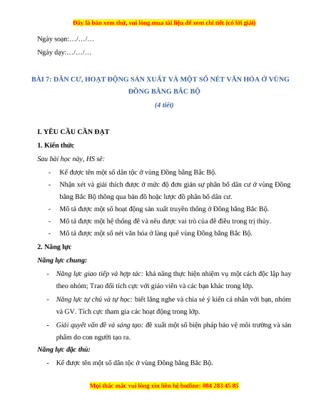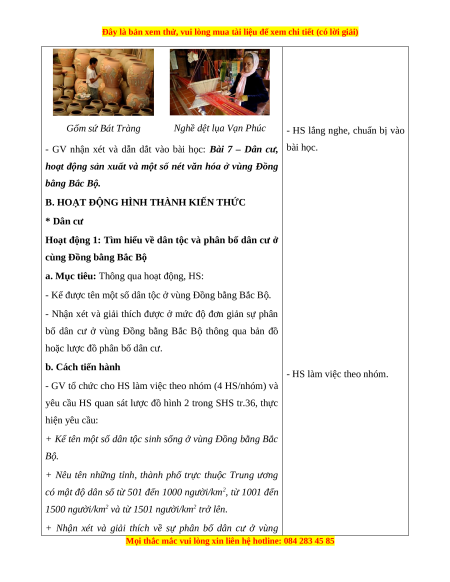 Giáo án Bài 7 Lịch sử & Địa lí lớp 4 Cánh diều: Dân cư, hoạt động sản xuất và một số nét văn hóa ở vùng Đồng bằng Bắc Bộ