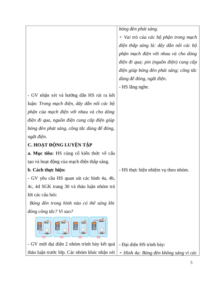 - Mô tả được cấu tạo và hoạt động của mạch điện thắp sáng gồm: nguồn điện,