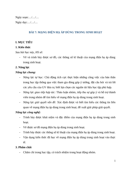BÀI 7: MẠNG ĐIỆN HẠ ÁP DÙNG TRONG SINH HOẠT I. MỤC TIÊU 1. Kiến thức