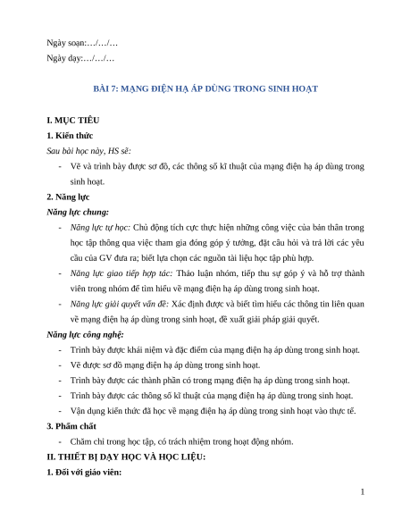 - Vẽ và trình bày được sơ đồ, các thông số kĩ thuật của mạng điện hạ áp dùng trong sinh hoạt. 2. Năng lực