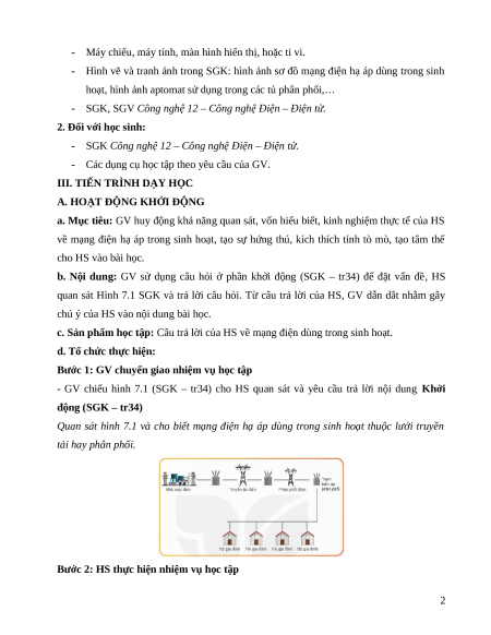 - GV dẫn dắt vào bài học mới: Bài học hôm nay sẽ tìm hiểu về mạng điện hạ áp dùng