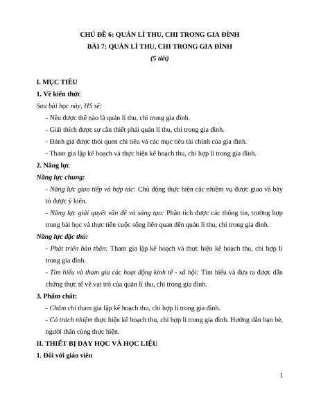 BÀI 7: QUẢN LÍ THU, CHI TRONG GIA ĐÌNH (5 tiết) I. MỤC TIÊU 1. Về kiến thức