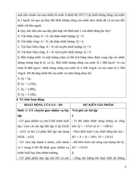 - GV chia lớp thành 6 nhóm, mỗi nhóm - Độ biến thiên nội năng của lượng khí là: