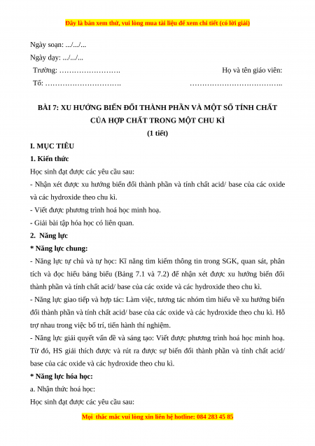 CỦA HỢP CHẤT TRONG MỘT CHU KÌ (1 tiết) I. MỤC TIÊU 1. Kiến thức