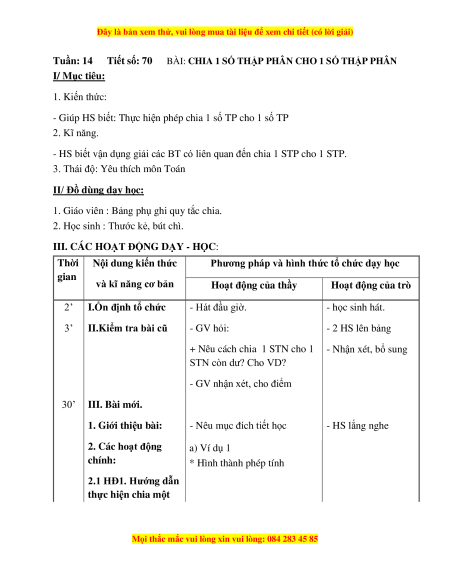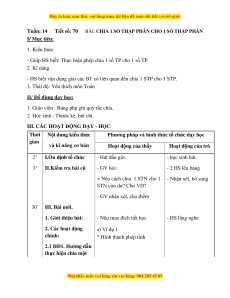 Tuần: 14 Tiết số: 70 BÀI: CHIA 1 SỐ THẬP PHÂN CHO 1 SỐ THẬP PHÂN I/ Mục tiêu: 1. Kiến thức:
